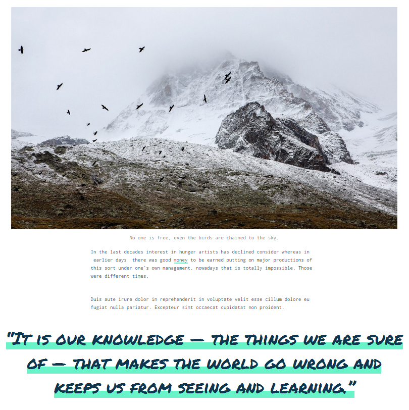 Styling for single posts is similar to the home page with the featured image serving as a fullscreen background for the title. Scroll further down and the post content is centered with no distracting sidebar widgets.