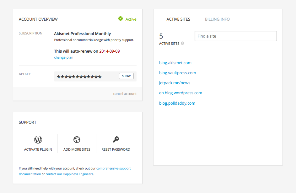 In the past it was difficult to know where to go for Akismet support. The new support section adds links to key documentation for common questions, the comprehensive knowledgebase, and the Happiness Engineers support team.