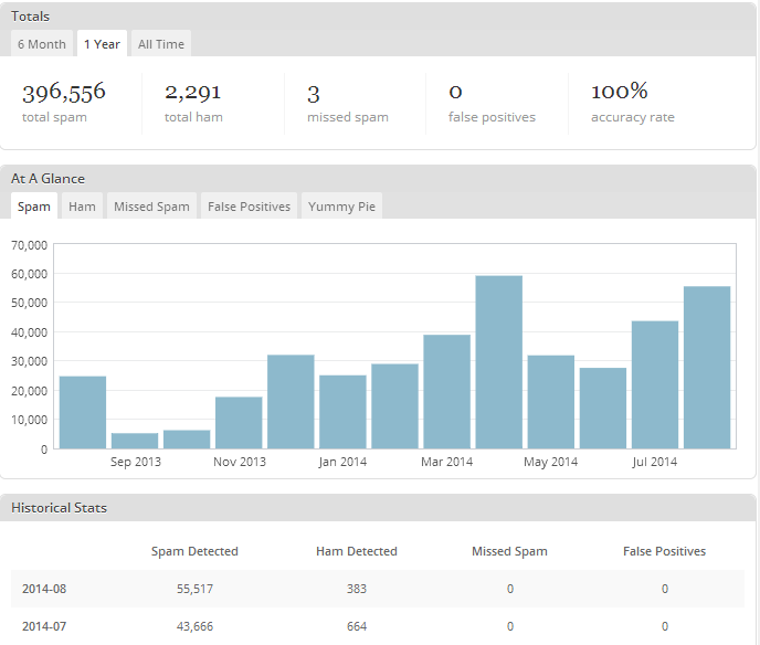 Each active account links to a full page of stats that illustrate how effective Akismet has been at deterring spam recently and historically. It’s also a great reminder of how much time Akismet is saving you every day.