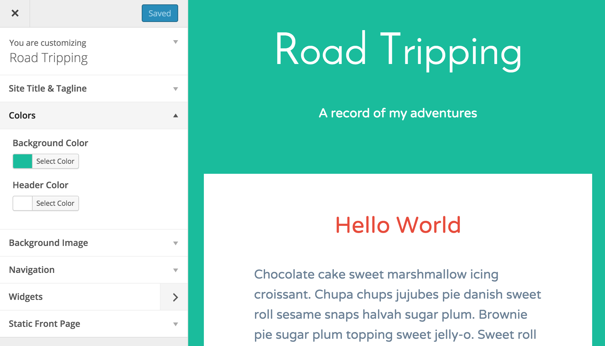 The theme includes customizer options for setting the background and header colors. You can also upload a background image. Aventurine’s creators recommend using a repeating pattern, such as the ones offered at subtlepatterns.com.