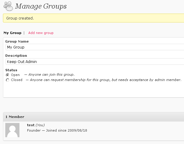 You can either create a closed or open group. Closed just means the membership has to be approved by an admin member. In order to check for new messages, you have to drop down the Groups menu and select messages. I would have liked to have seen a dashboard widget for this. Also, I wouldn’t mind seeing a number show up in the groups menu header like the plugins that told me how many new messages there were so I wouldn’t have to manually check. As for the message area itself: