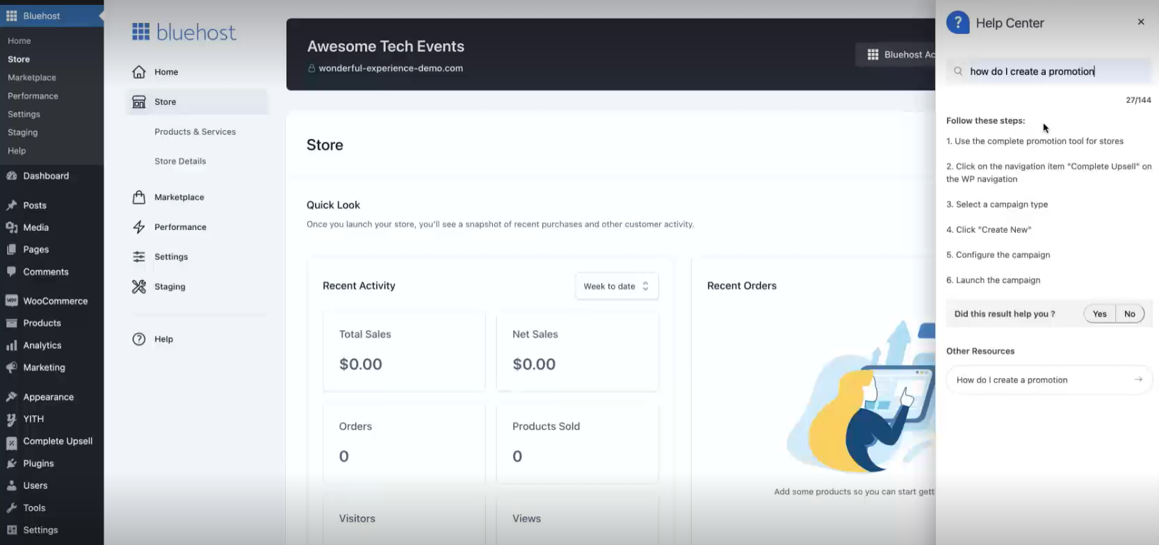 Existing Bluehost customers can find the updated plugin in their WordPress sites with the new products available. Onboarding is currently only available for users starting new websites but a representative said they are working on creating a path that allows existing customers to re-route through the onboarding experience.