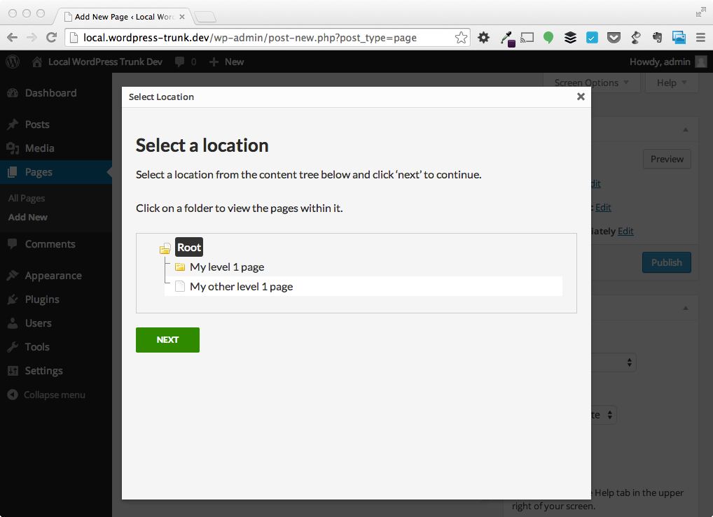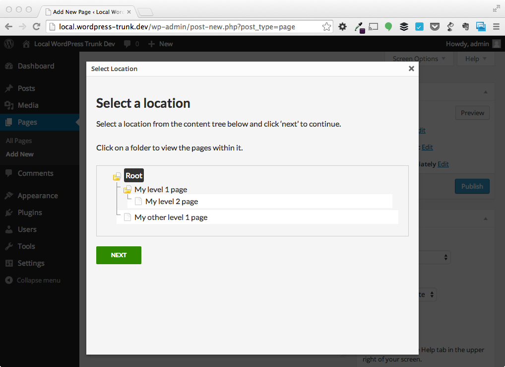 When you go to Pages > Add New, you’ll see a new modal prompting you to select a location from the file tree: