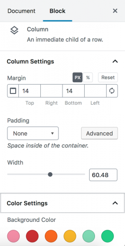 The Row and Column blocks also come with fine-grained controls for adjusting background and text color, width, margin, and padding.
