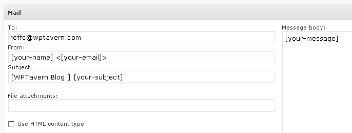 Once we have the form put together, we’ll need to configure the Mail options so when someone submits a form, it will be sent to our inbox. The TO: field at the top is the email address where submitted forms will be sent to. The from box is simply the form fields that were filled out and the subject area provides you with the opportunity to create a custom message header which I have done in the following screenshot so that I can create a custom email filter for Thunderbird. Also, this lets me know that a message was sent from the WPTavern website.