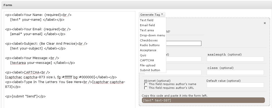 But before you can use that form, we’ll need to configure the necessary fields. This is the Form area. On the left hand side is a text area containing the HTML as well as the shotcodes for your contact form. On the right, you should see a Generate Tag drop down button. When you click this, you have a bunch of options to choose from regarding fields. For instance, you can add a drop-down menu, radio buttons, checkboxes, CAPTCHA, file upload, etc. Here is my contact form already configured on the left with a look at the tag generator on the right.