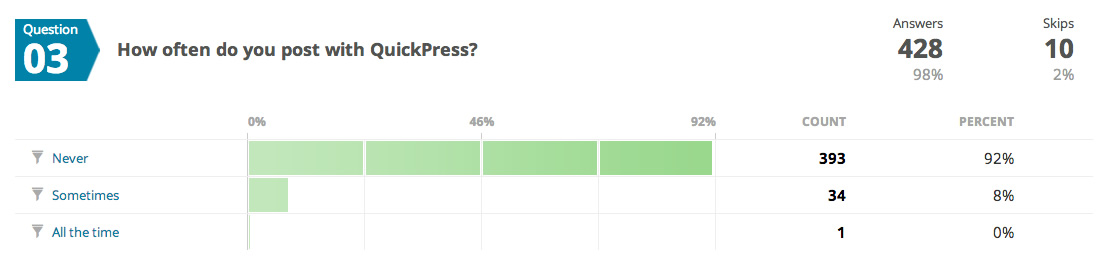 Question 3 asked, How often do you post with QuickPress? it’s almost comical to see the response of Never take 92% of the vote.
