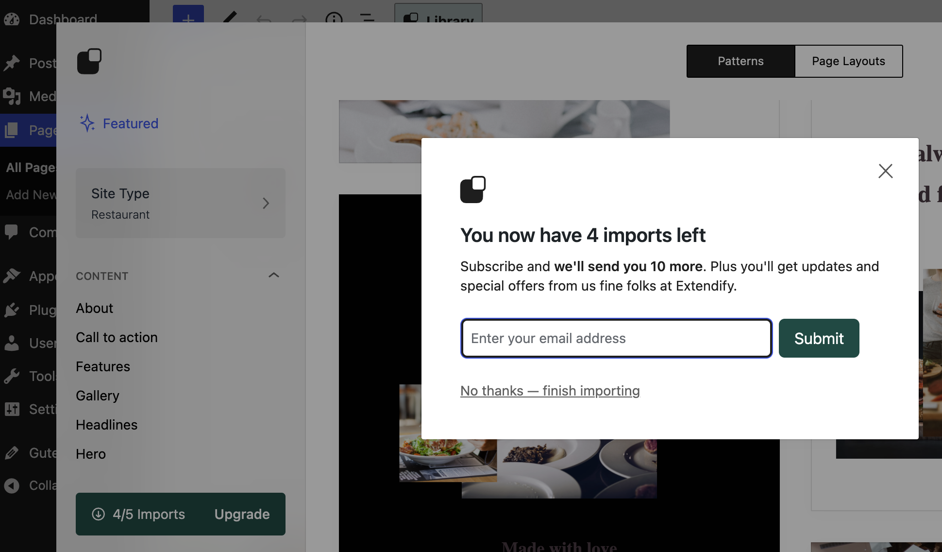 Users who are not planning to upgrade must be judicious about the patterns and layouts they choose to preview on the page. The plugin will warn free users about the remaining number of imports before proceeding. This mode of limitation may slow the plugin’s adoption, because users have to be careful about trying too many patterns and layouts on their sites. The plugin’s FAQs state that “Each user receives a limited number of imports completely free” but users would be better served by knowing that it’s a total of five imports before installing.