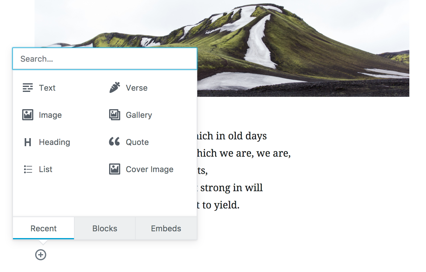 With the growing number of block types, it can be cumbersome to sort through all of them when adding a new block. Gutenberg 0.5.0 implements a new display for recent blocks. A maximum of eight are shown and the most recently used ones are displayed at the top. It does not yet persist between editor sessions, but Gutenberg contributors plan to add that in the future.