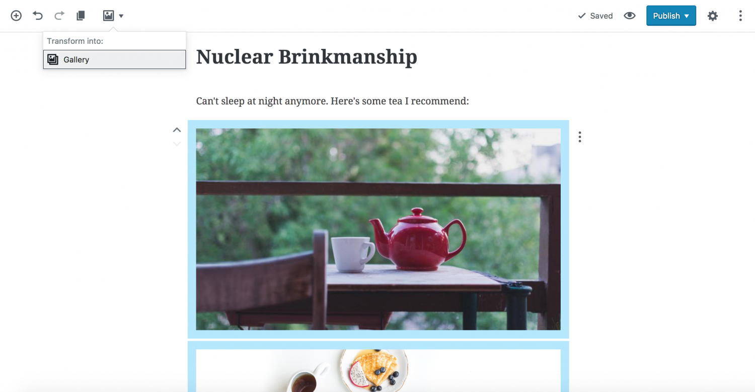After selecting two or more blocks, the user can click on the block’s settings in the toolbar to transform them. They can also be easily changed back to single blocks. The multi-block transform functionality has been added to the Blocks API so that developers can set isMultiBlock to true to specify blocks that can be transformed.
