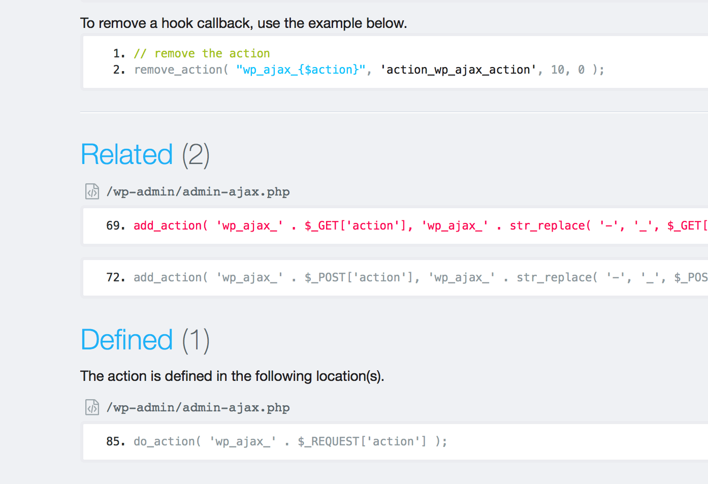 Usage examples for every action, filter, function, and constant can now be easily copied. Users can also quickly view source code with Hookr’s new hyperlinked and annotated source code blocks.