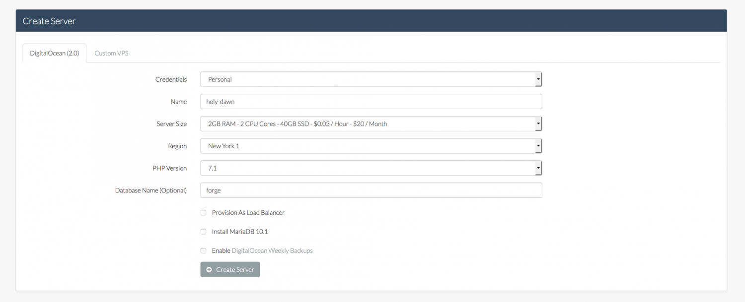 Because so many WordPress developers are used to managed hosting, the thought of running their own servers seem quite intimidating. That’s a shame with so many great cloud server companies offering virtual servers for very low costs. Unless your traffic is very heavy, a small ($5 to $10 per month) server can run quite a few WordPress websites. Laravel Forge takes care of provisioning your servers and can even setup your database and install WordPress for you. This makes cloud hosting much more available to WordPress developers at a low cost (Laravel Forge is $15 per month for unlimited servers), compared to many of the existing options.
