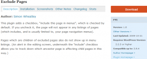Now let’s take a look at one of my favorite plugins, Exclude Pages. The plugin page tells me the authors name of the plugin which also links to the users profile. There is also a link to the authors homepage and a link to the plugin homepage.