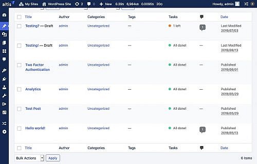 Status of the publishing tasks is also shown in its own column in the posts list table, a useful feature for giving editorial teams a better overall picture of posts in progress. (The plugin also provides a way to disable this view.)