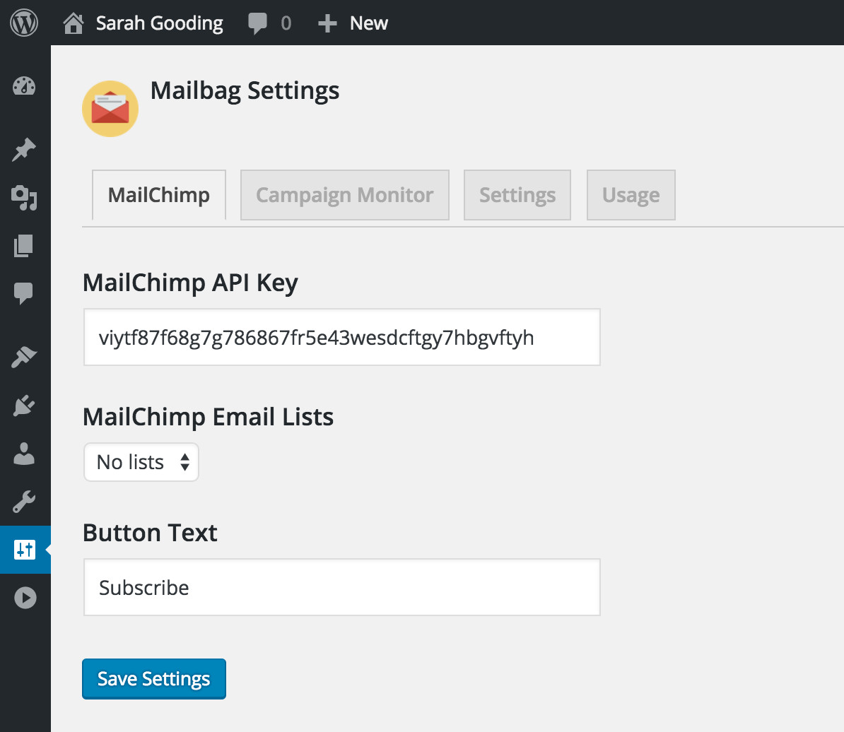 If you have your Mailchimp or Campaign Monitor API key handy, then you can add your email subscription form in under a minute. Paste in the key, select your list, and customize your button text. (Your API keys must be saved before you can select a list to add subscribers.) Once these settings are saved, you can place the shortcode anywhere within your content.