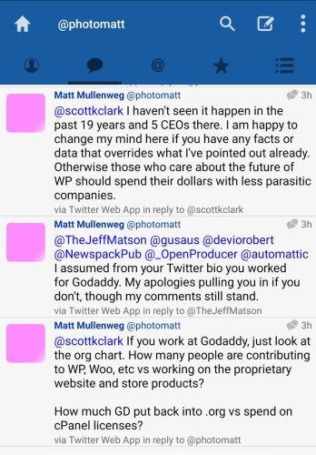 On Thursday Matt Mullenweg responded to an inquiry on Twitter from Jeff Matson, a Pagely employee, about whether Automattic’s Newspack platform had all open open source components or some proprietary elements. In his response, he formally identified GoDaddy as “an existential threat to WordPress’ future.”