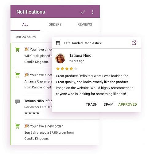 • Get notifications about orders and reviews, and the ability to moderate them.