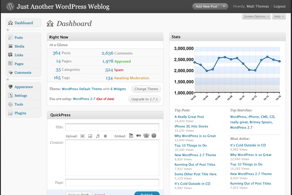 If we rewind our calendars to October 2008, WordPress was undergoing a major UI change from 2.5 codenamed CrazyHorse. This new UI was described as sexy, awesome, Wow! out of the box, etc. It was definitely a large improvement over WordPress 2.5 both in usability and looks. While I can’t find the article which contained the screenshots, there was at least one instance where MovableType showcased a screenshot of a new UI that was designed that looked very similar to the back-end of WordPress which was flattering to say the least.