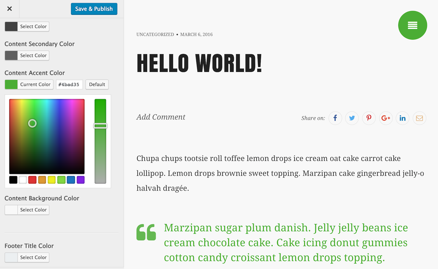 Background, text, title, and accent colors can be easily set with the built-in color picker controls.