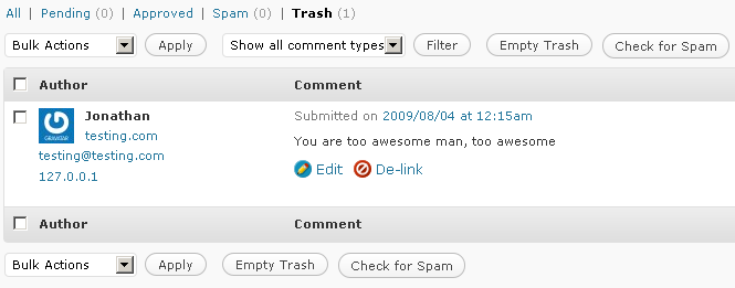 One thing I’ve noticed is that it appears as though each area has it’s own trash bin. That means there are three different trash cans. One for comments, one for pages, and one for posts. I’m not sure if that is the correct way to go about it as I’d like one trash can to rule them all with a drop down box to select different items. Since this is part of the developmental version of WordPress, chances are things will change with it’s implementation before it hits the public. I know at one of the next dev meetings I attend, I’ll be talking about this trash status and adding my input.