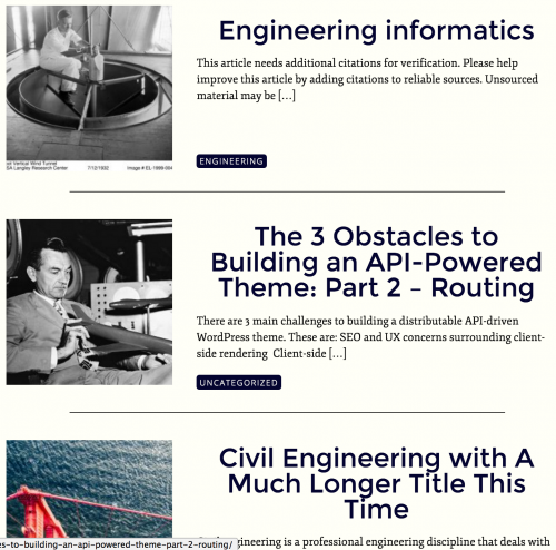 “From a programming perspective, this was way more difficult to create than a PHP-rendered theme, because you get so much ‘for free’ with the PHP theming API that you don’t get when you’re just making raw requests to the REST API,” Kirby said. The primary advantage of theming with the API is more instantaneous interactions with the content, but creating API-driven themes is not yet as easy as the old way of theming.