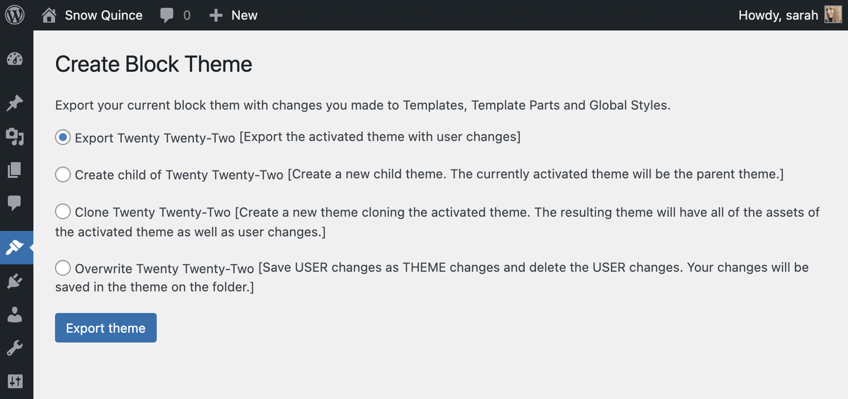 All of these export options are available under Appearance >> Create Block Theme.