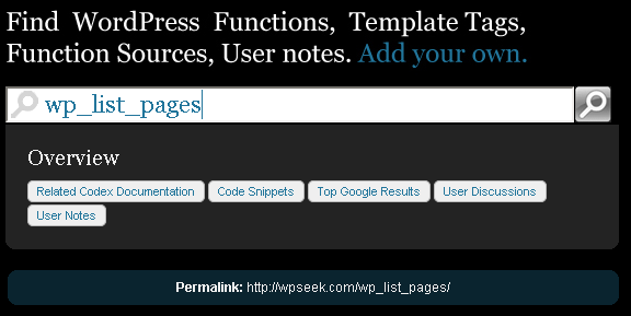 Ever wish you could search for WordPress functions, template tags, function sources, user notes, etc all from one place? That is exactly what WPSeek.com allows you to do as it acts as a very slick WordPress centric search engine.