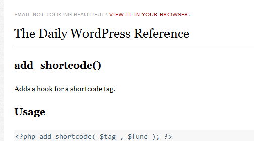 How would you like to experience WordPress functions within your inbox on a daily basis? If so, consider signing up to the WordPress Daily Documentation site. Each day features a different function within WordPress sent to your inbox which contains examples, an explanation of what the function does, parameters, and the usual information you would find via other sources. Since signing up, I’ve received emails covering add_shortcode() and get_the_ID().
